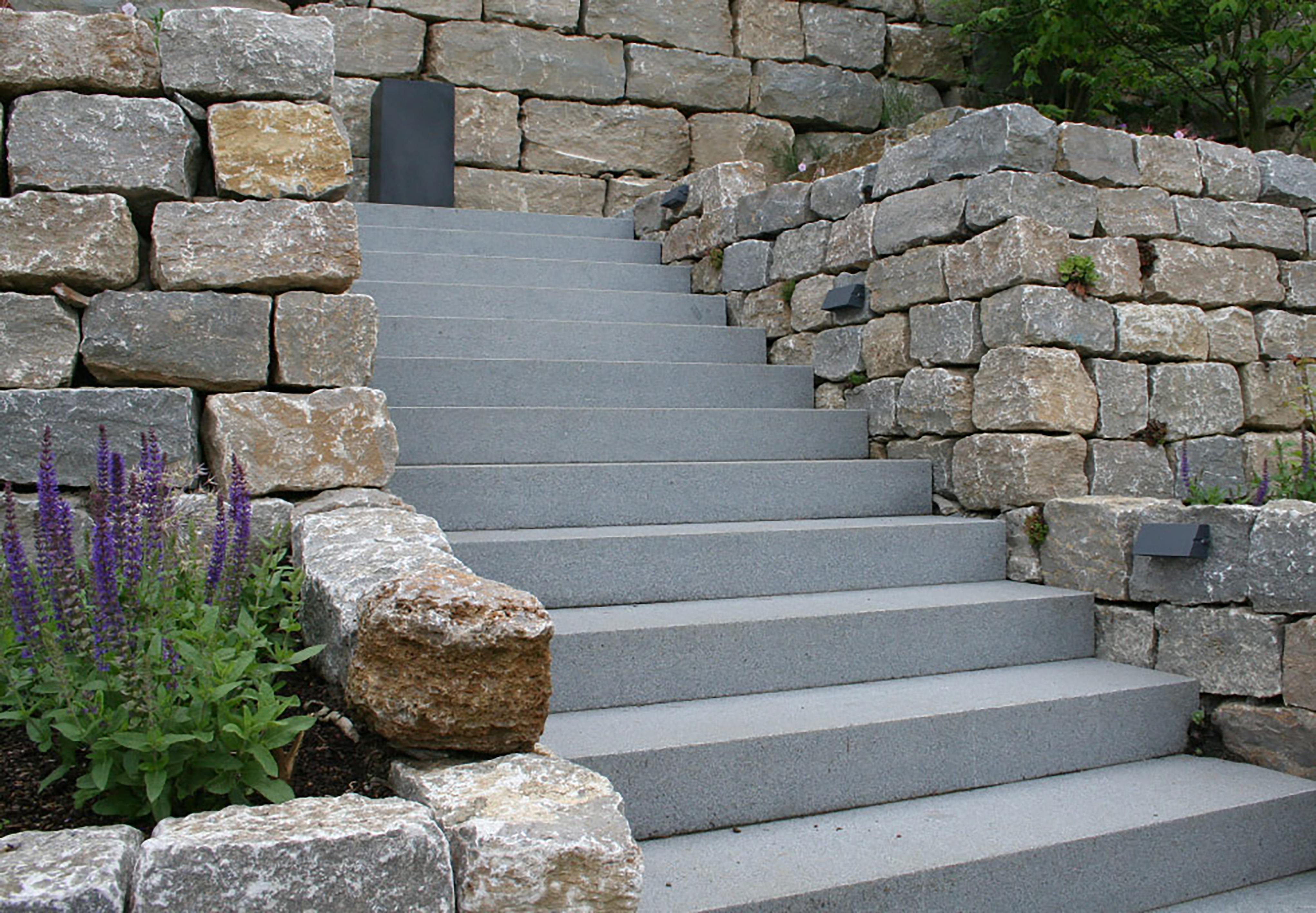 - Stützmauer: Massiv gebaut aus großen Quadern, gesetzt mit dem Bagger. Hier empfiehlt sich der Fachmann.