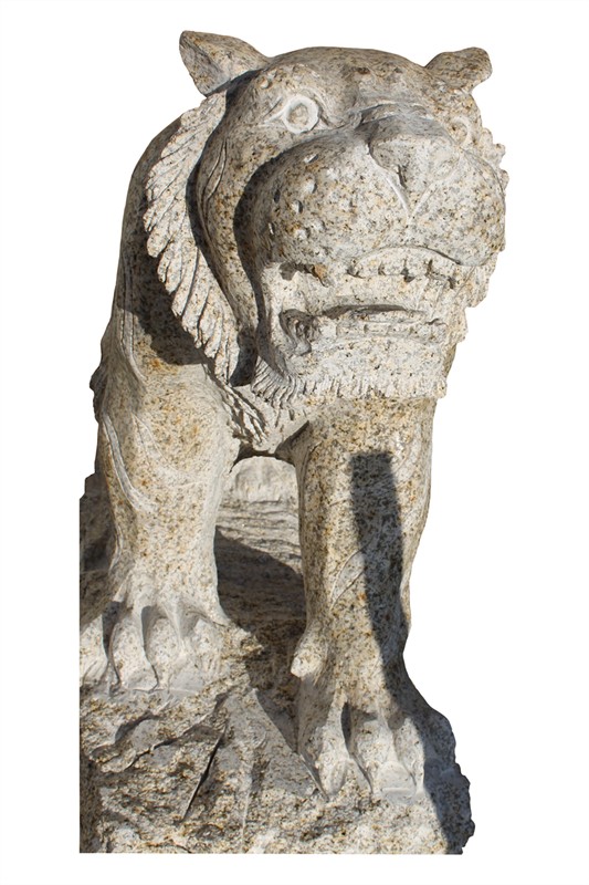 Imposanter handgearbeiteter Tiger aus gelbem Granit, teilweise poliert. Maße ca. 115 x 40 x 100 cm, Gewicht ca. 200 kg. Perfekte Gartendekoration, frostsicher und einzigartig.