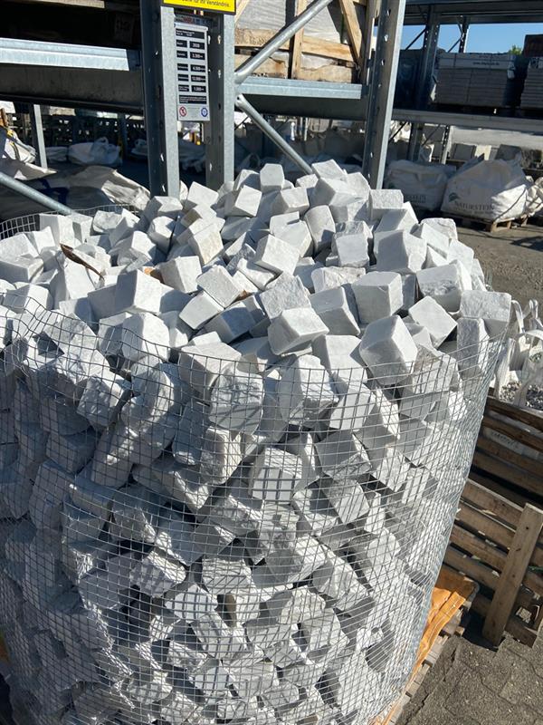 Das Mosaikpflaster aus Carrara-Marmor überzeugt durch seine einzigartige Optik: feine Marmorierung in Weiß und Grau sowie eine rustikale Oberfläche mit leicht gebrochenen Kanten – perfekt für einen authentischen Vintage-Look. Trotz seiner eingeschränkten Witterungsbeständigkeit wird Marmor im Außenbereich bewusst für Muster, Einfassungen und Zierelemente eingesetzt. Kleine Risse und Abbrüche unterstreichen den antiken Charakter, beeinträchtigen jedoch weder Stabilität noch Optik bei fachgerechter Verarbeitung.
