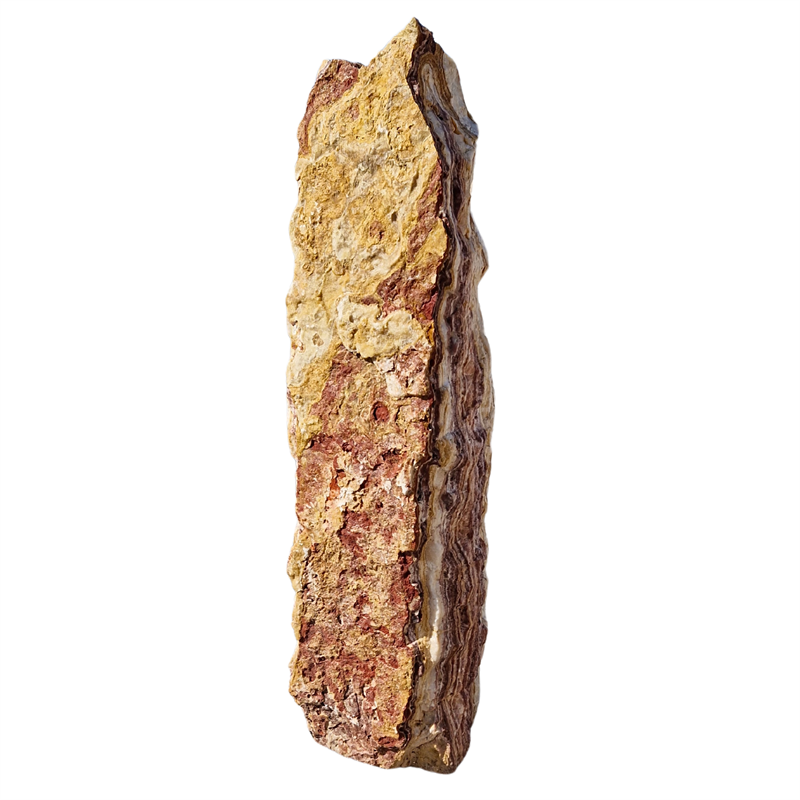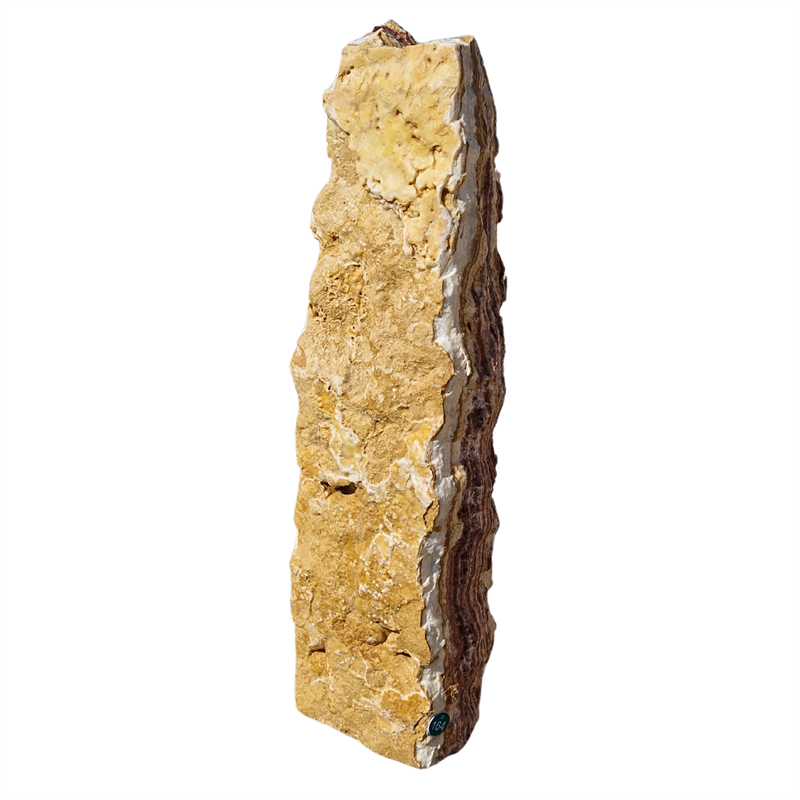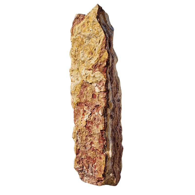 Der Monolith Angel Sparks ist ein imposanter Solitärstein aus echtem Onyx (Onice) mit Ursprung in der Türkei. Seine außergewöhnliche Maserung in erdigen Brauntönen, durchzogen von weißen und rötlichen Adern, macht ihn zu einem starken gestalterischen Element im Garten. Die naturbelassene Oberfläche unterstreicht die ursprüngliche Kraft des Steins. Er ist in unterschiedlichen Höhen zwischen 25 und 200 cm verfügbar und eignet sich hervorragend für moderne, naturnahe oder auch kontrastreiche Gestaltungskonzepte im Außenbereich.