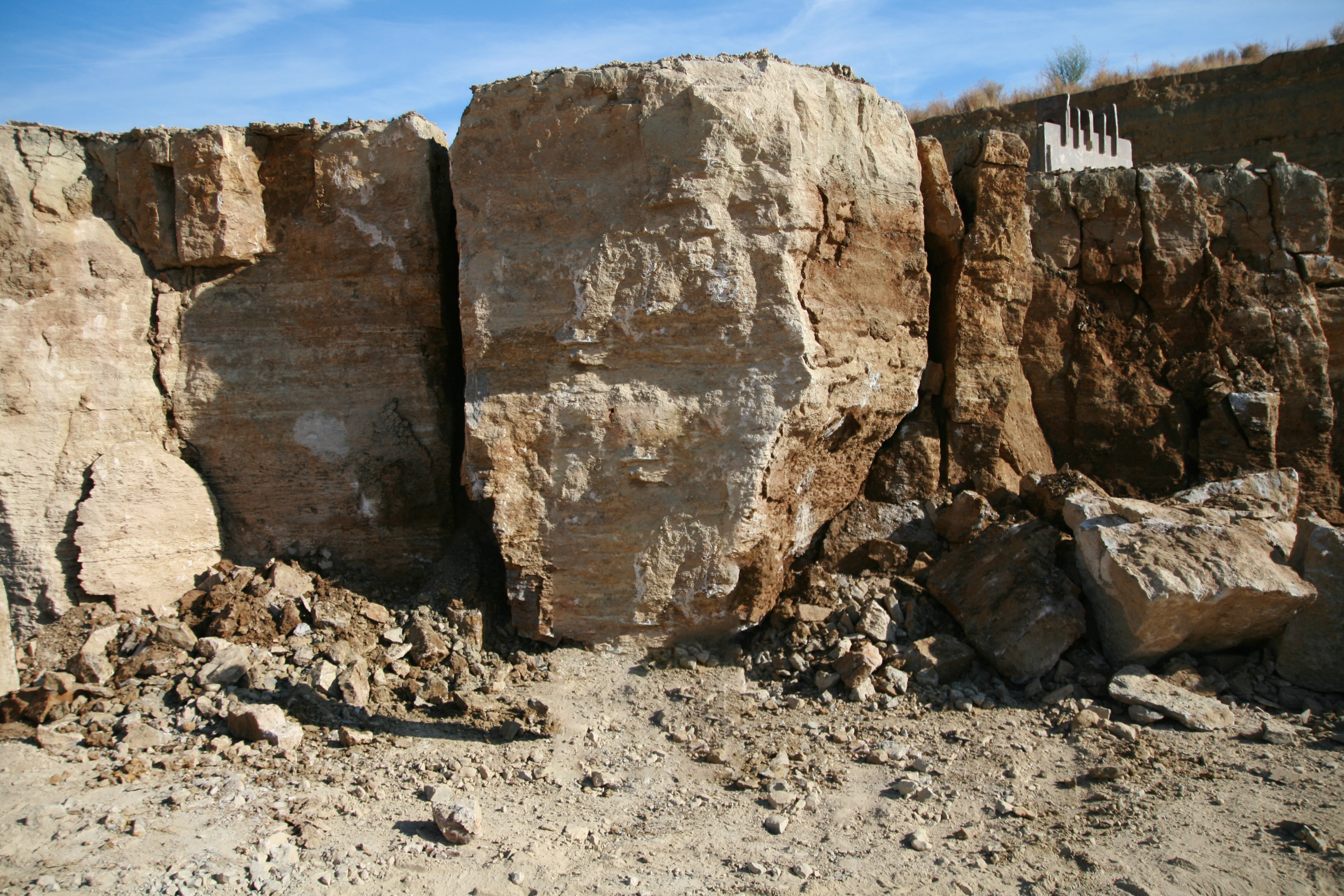 - Den Einsatz von Maschinen wie Radladern und Baggern zur Verarbeitung großer Quadersteine.