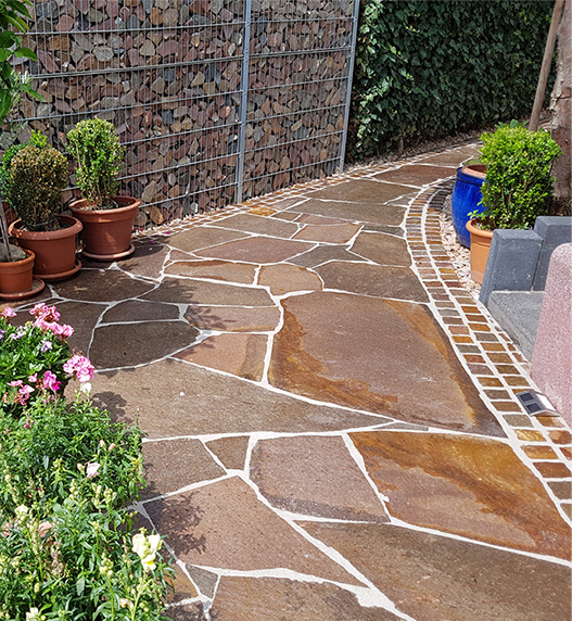 Quarzit ist ein metamorphes Gestein, das aus Sandstein durch Verpressen entsteht und in Ländern wie Griechenland oder Brasilienabgebaut wird. Es zeichnet sich durch seine Härte, Dichte und Beständigkeit aus und kann verschiedene Farben wie Grau, Gelb, Rosa und Grün aufweisen. Quarzit wird aufgrund seiner Härte, Vielfalt an Farben und Beständigkeit oft für Bodenbeläge oder Treppenstufen verwendet. Wir führen XXL Gartenplatten aus Quarzit, aber auch Mauersteine und Wand Verblender. Suchen Sie eine individuelle Bearbeitung von Oberflächen Ihres Terrassenbelags? Hier könnte Quarzit der passende Stein sein.
