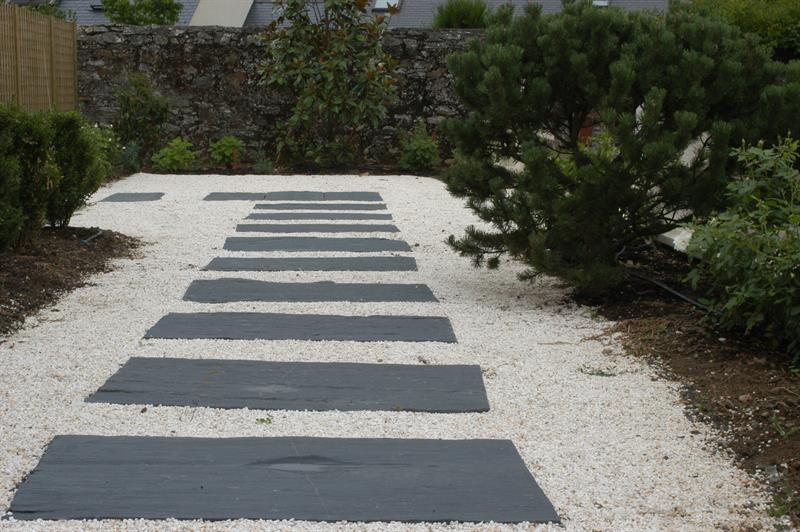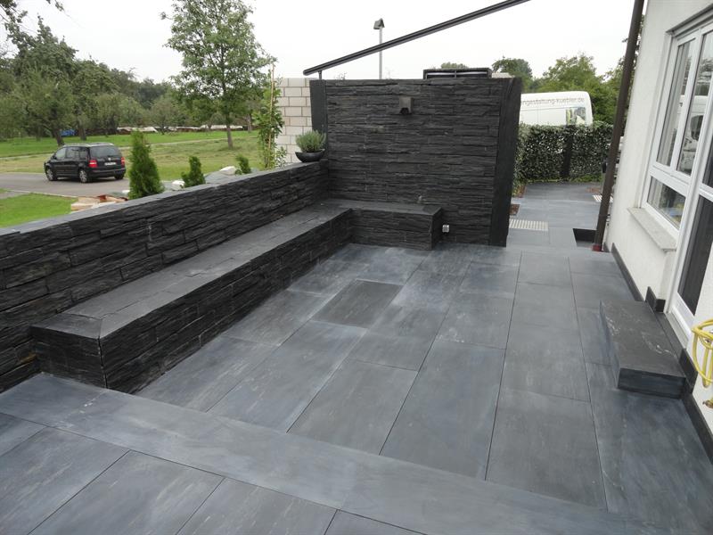 Anwendungsbeispiele: Schiefer wird meist als Stele, Sichtschutz oder als einzelne Schrittplatten im Garten verlegt. Natürlich können damit auch Terrassenflächen belegt werden, jedoch erschwert die wellige Oberflächenstruktur das stellen von Mobiliar.