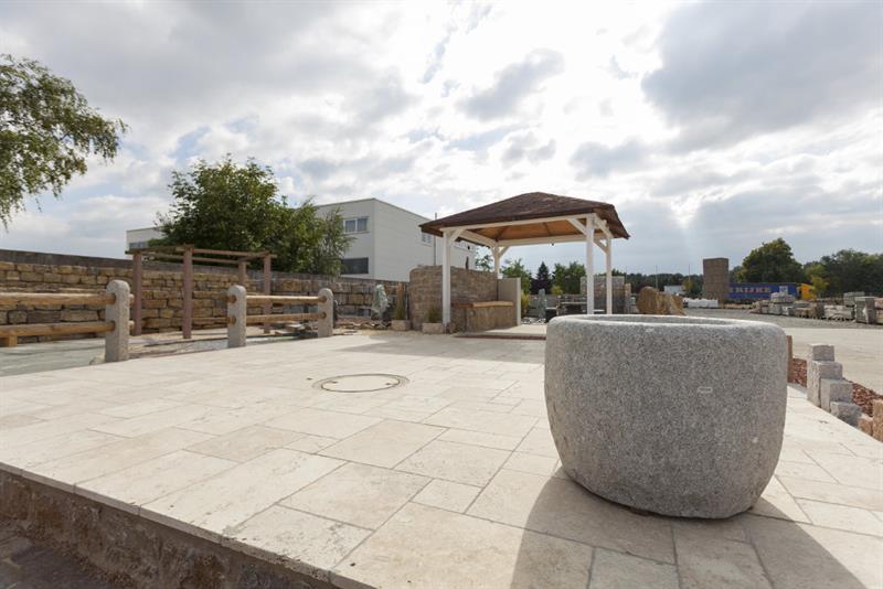 Anwendungsbeispiele: Travertin ist mit seinen mediteranen Farbtönen besonders im Garten beliebt. Es lassen sich wunderschöne Terrassenflächen, Poolumrandungen oder Gehwege damit befestigen. Die geschliffene Oberfläche macht ein Barfußlaufen zum echten Genuß.