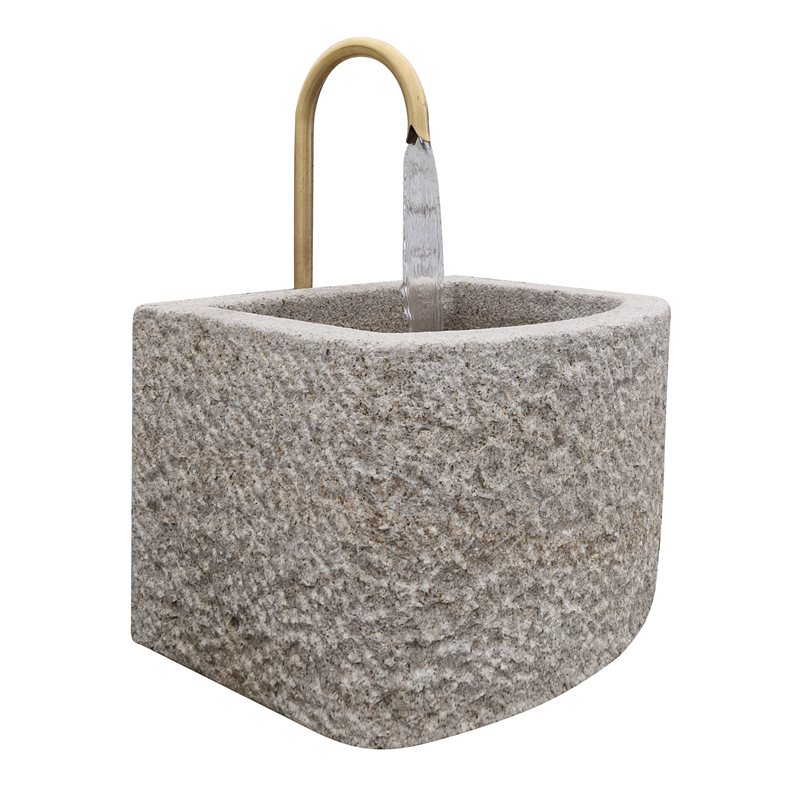 Eleganter Granitbrunnen in halbrunder Form mit hochwertigem Messing-Umlaufsystem – betriebsbereit mit Pumpe und Abdeckung.