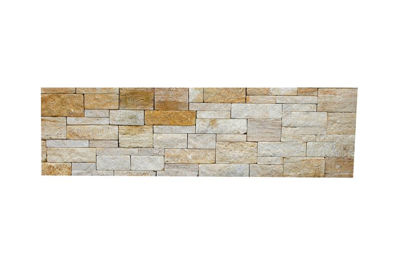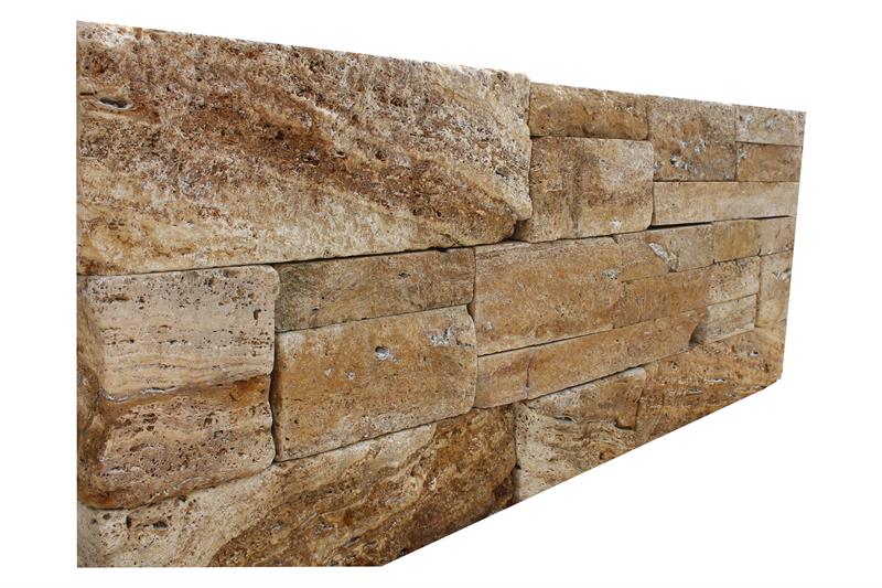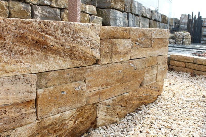 Hochwertige Mauersteine aus Travertin Giallo in warmen Gelb- und Brauntönen, perfekt für Systemmauerwerk.