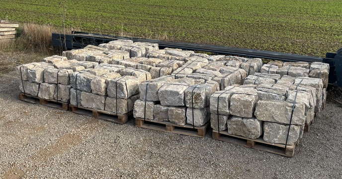 Unsere Muschelkalk Mauersteine SELEKTION werden im firmeneigenen Steinbruch in Gaubüttelbrunn (Landkreis Würzburg) abgebaut und hochwertig verarbeitet. Sie zeichnen sich durch ihre bruchraue Oberfläche, das einheitliche Erscheinungsbild und den Verzicht auf Bohrspuren in der Sichtfläche aus – ideal für einseitig sichtbares Mauerwerk mit natürlicher Optik.