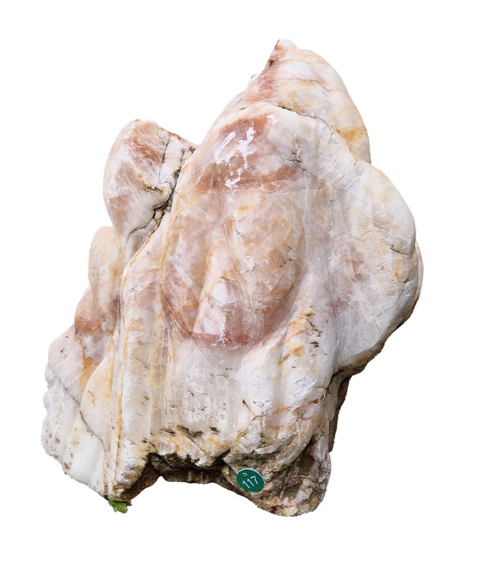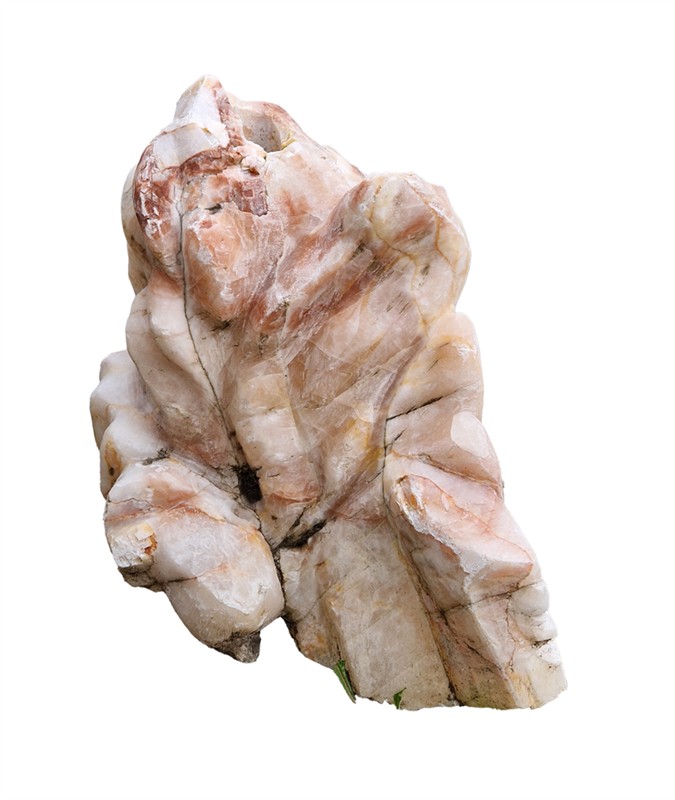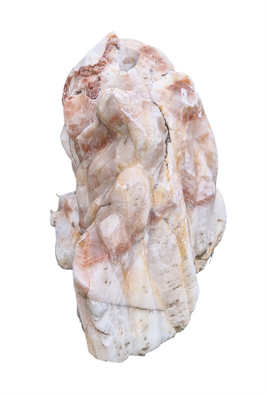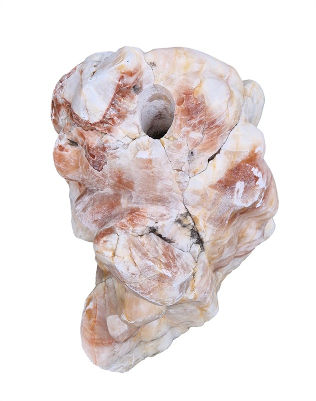 Der Onyx-Findling OX1 beeindruckt mit seiner skulpturalen Form und den faszinierenden Farbverläufen von Cremeweiß über Apricot bis hin zu Rosé. Die bereits eingebrachte Quellbohrung macht ihn zum idealen Mittelpunkt für ein stilvolles Wasserspiel im Garten.