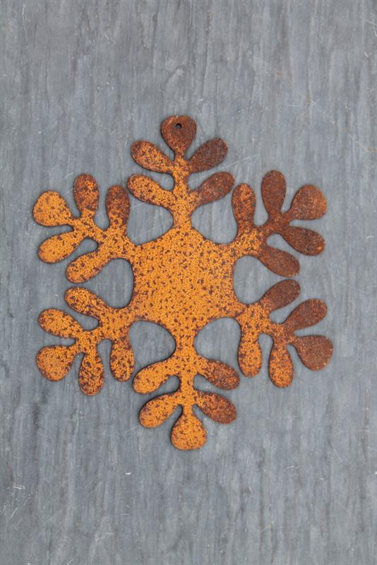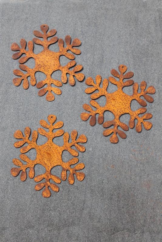 Die Schneeflocke besteht aus massivem Cortenstahl, der eine natürliche Rostpatina bildet. Bitte beachten: Edelrost kann abfärben, daher nicht direkt auf Textilien oder empfindliches Holz hängen.