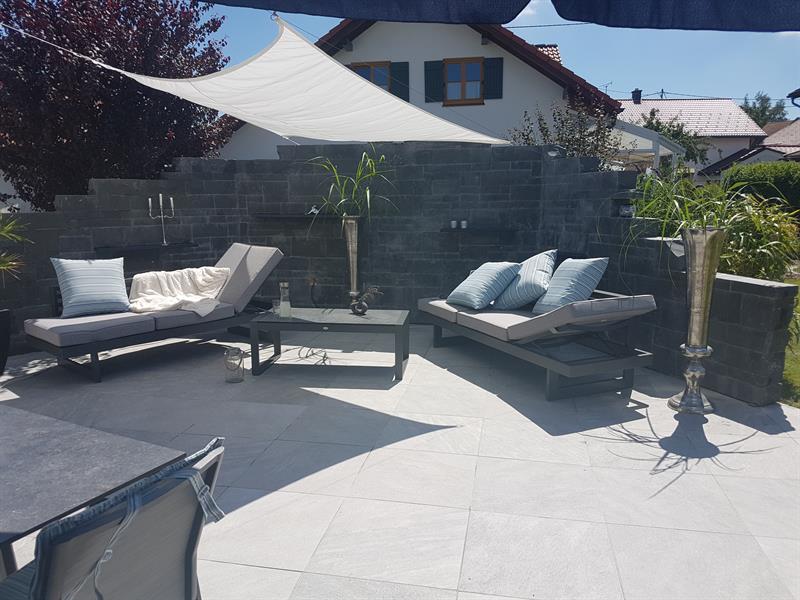 Vielseitige Basalt-Mauersteine in drei Höhen für doppelseitige, freistehende Mauern. Gesägte Fugen und gespaltene Ansichtsflächen für ein natürliches Design.