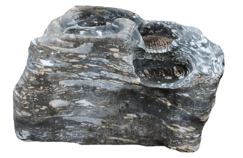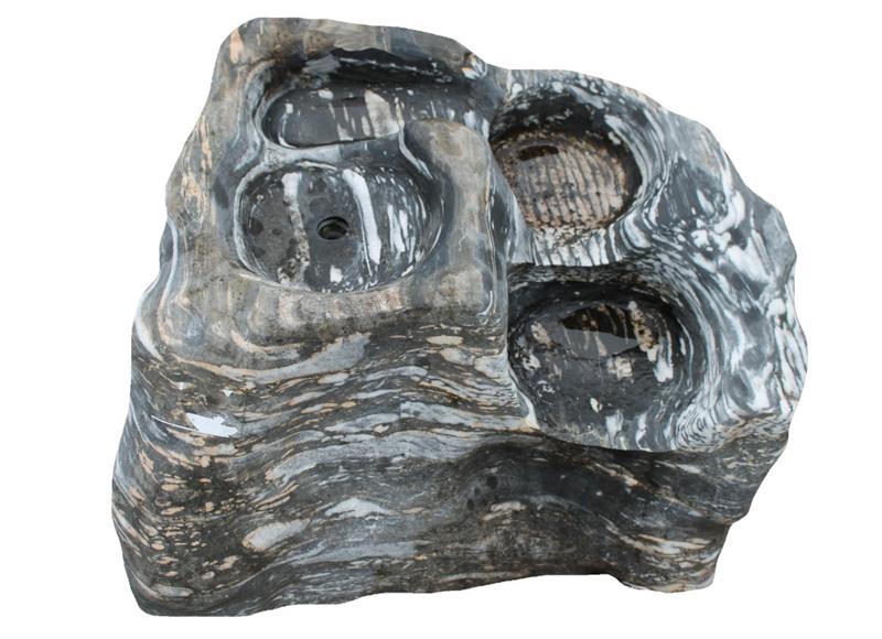 Der Quellstein „Plitsch Platsch Nr. 2“ überzeugt mit einer natürlichen Formgebung und vier klar erkennbaren Stufen, über die das Wasser effektvoll fließt. Mit seinen markanten Farbschattierungen in Schwarz-Anthrazit, Weiß und braun-beigen Einschlüssen ist dieser Stein ein echtes Unikat – perfekt für individuelle Wasserspiele im Garten.